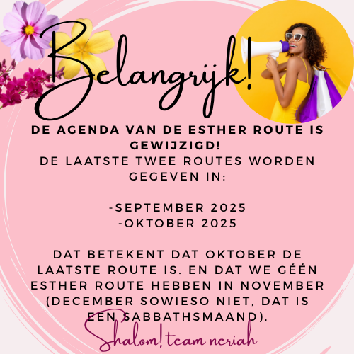 Dat betekent dat oktober de laatste Route is. En dat we géén Esther Route hebben in november (december sowieso niet, dat is een sabbathsmaand).