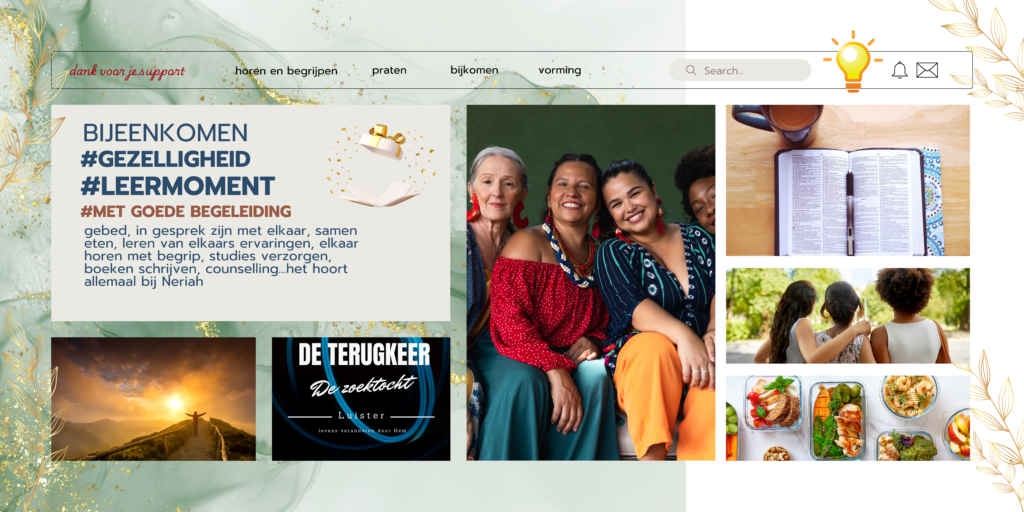 We verzorgen bijeenkomsten zoals de Esther Route om vrouwen op te bouwen; we dragen bij aan het versterken van geestelijke banden én een dieper over de liefde en verlossing van Yeshua. Dit doen wij onder meer met Pesach. Daarbij zijn er ook de gezamenlijke maaltijden, de series Bijbelstudies die wij met ons team opzetten en uitwerken, plus het schrijven, ontwerpen en uitgeven van geestelijk opbouwende boeken in eigen beheer. Dit alles om te werken als vrouwen die de Goede Boodschap in de maatschappij willen delen.